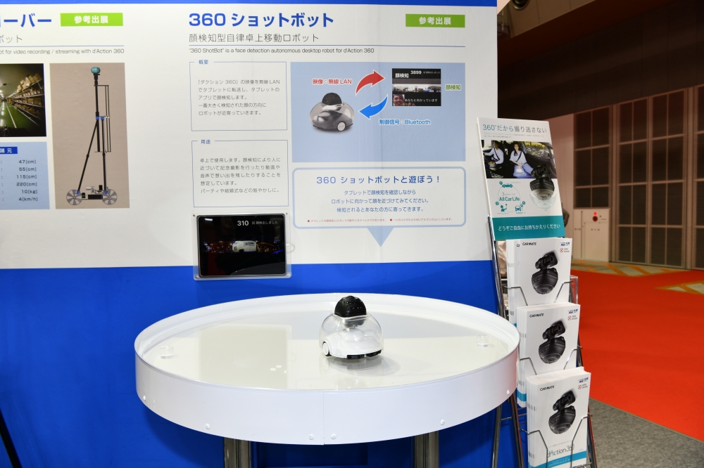 『ダクション 360』を使った顔検知型自律卓上移動ロボット。360°撮影の用途提案として展示いたします。
